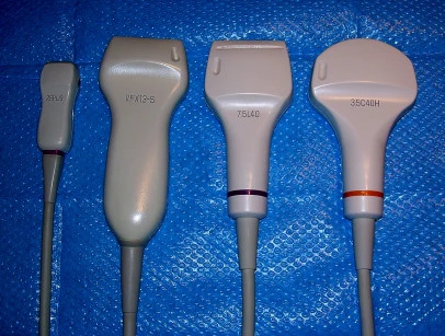 Sonda lineal: imagen rectangular. Cristales en línea. Haces paralelos. Uso en músculos, tiroides, mama, partes blandas. Frecuencia alrededor de 10 MHz.